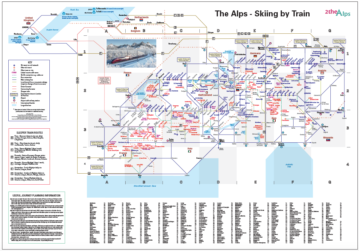 - clear mapping showing the rail network through the Alps and the location of over 400 ski resorts